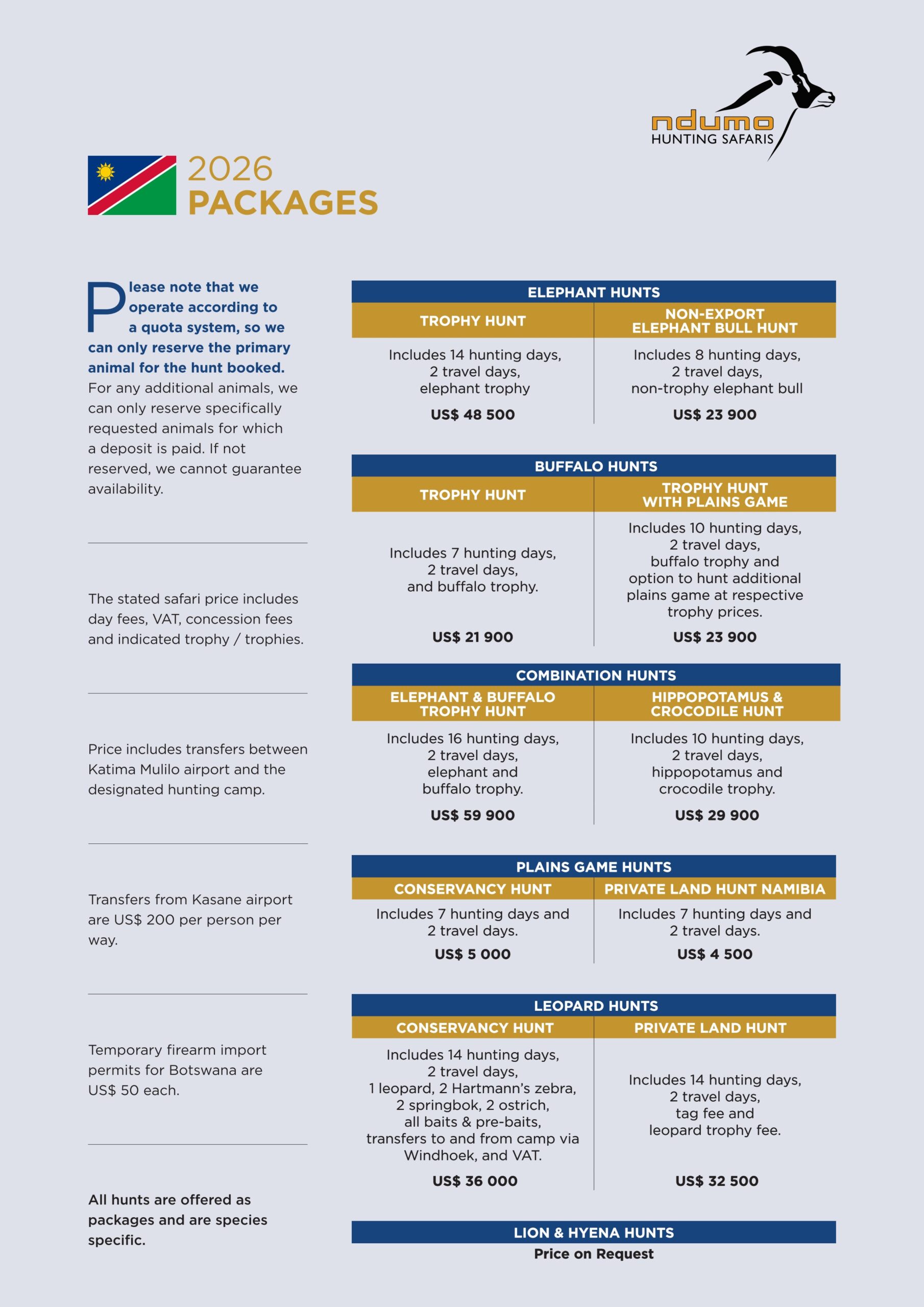 The price includes transfers between Katima Mulilo Airport and the designated hunting camp.